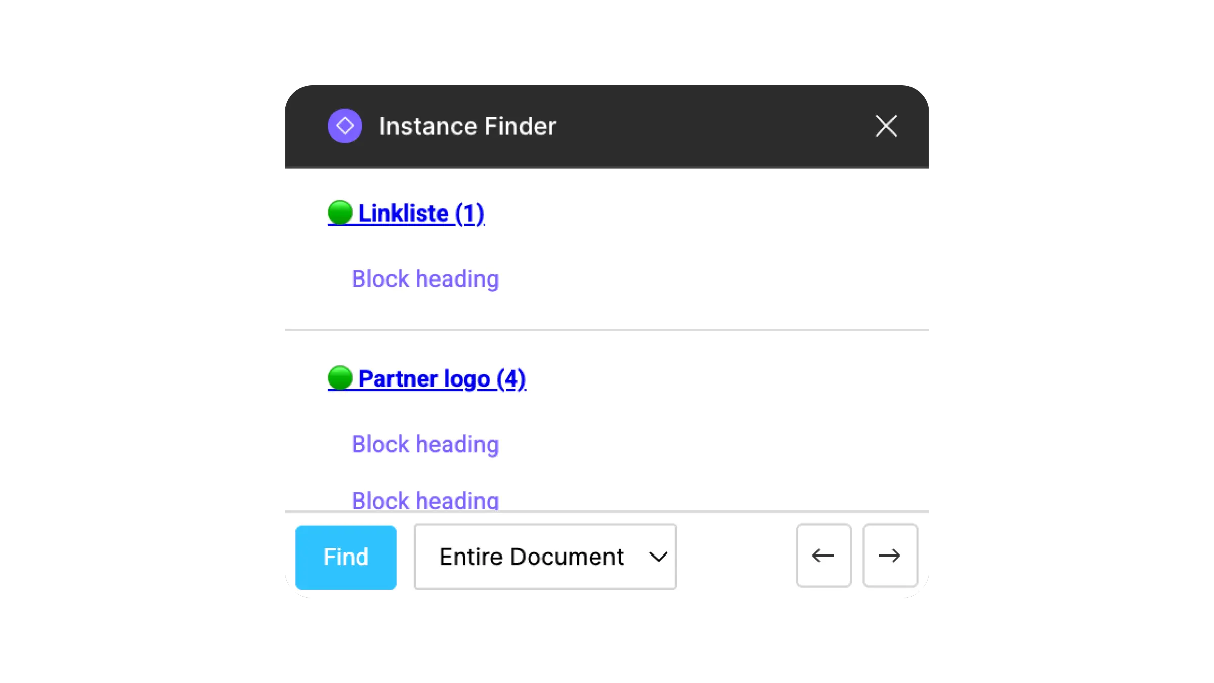 Instance Finder allows you to select a component and view all instances of that component with anchor links across pages in an entire document.