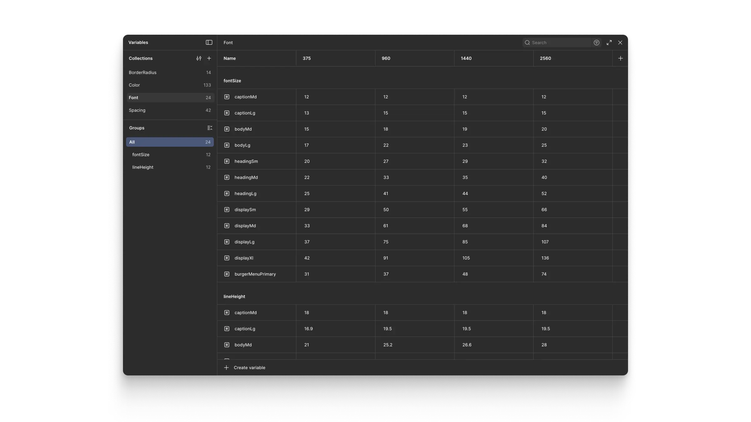 Variable Collections, Variable Modes, and Variables in Figma generated by Token Studio.